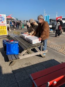 イカやタコなどお目当てのものをゲットして満足しているジーサンズ。