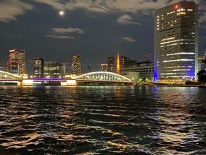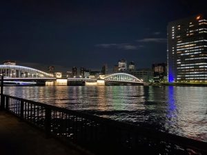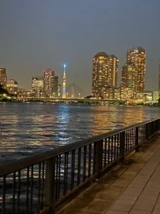 いつも帰りは隅田川沿いから帰宅しており夜はスカイツリーや勝どき橋がきれいにライトアップされています。