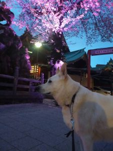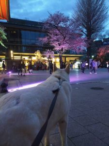 夕方の散歩だったので、ライトアップが綺麗で一休憩していました。