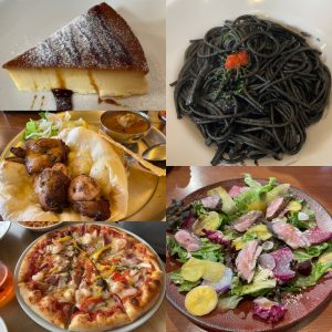 左上のプリンと右上のイカ墨パスタは江ノ島のイタリア料理